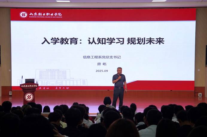 秋高气爽,新学期伊始,信息工程系、嘉环ICT产业学院党总支书记房屹在文昌湖学术报告厅,为学生讲授以“坚定信仰,勇担使命”为核心的“开学第一课”。课程既从思想与生活层面入手,引导学生坚定理想信念、快速融入新学期,同步深入解读党建引领下“励行书院一站式学生社区”的建设理念与实践路径;也围绕认知与学习维度,详细介绍淄博文化、学校概况、院系特色及课程考核等内容,全方位为新生勾勒清晰的大学生活蓝图。